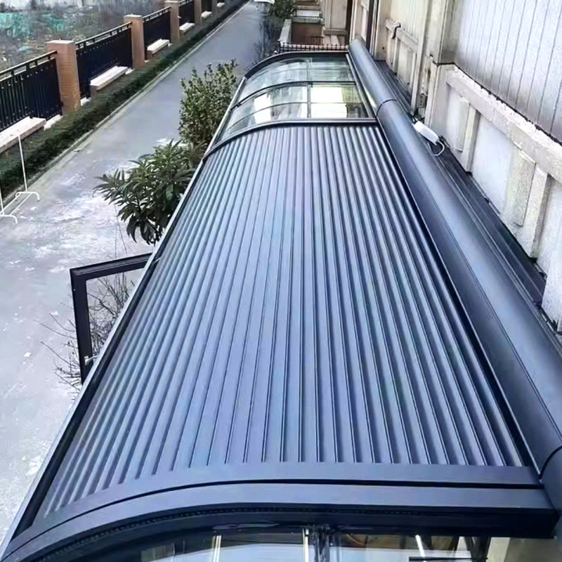 Đây là hệ che nắng mái kính bằng lá nhôm cuốn tự động, vận hành trên hệ ray dẫn hướng, sử dụng động cơ chuyên dụng để: