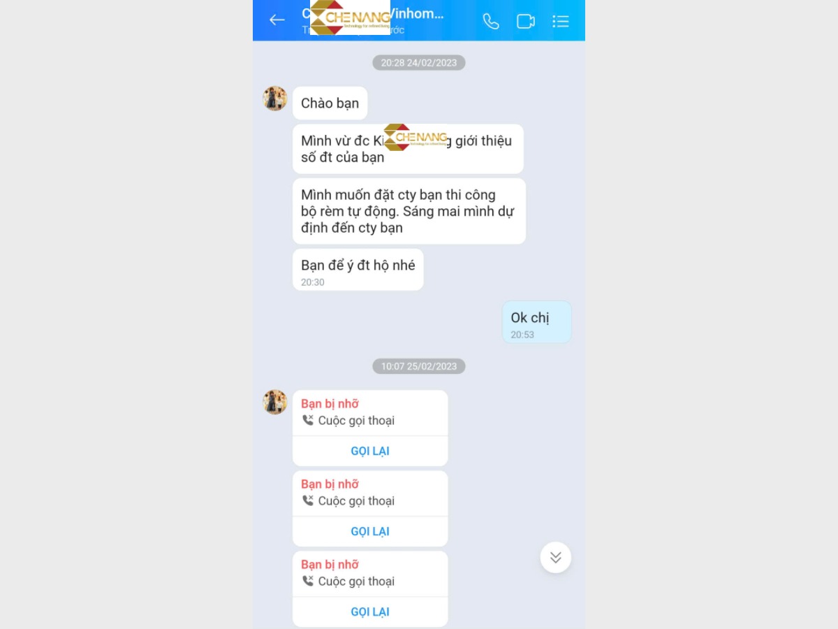 “Chị được bạn K.P giới thiệu làm rèm tự động. Mai chị qua công ty để trao đổi trực tiếp với em nhé.” (K.P là đối tác của bên mình tại Hải Phòng)