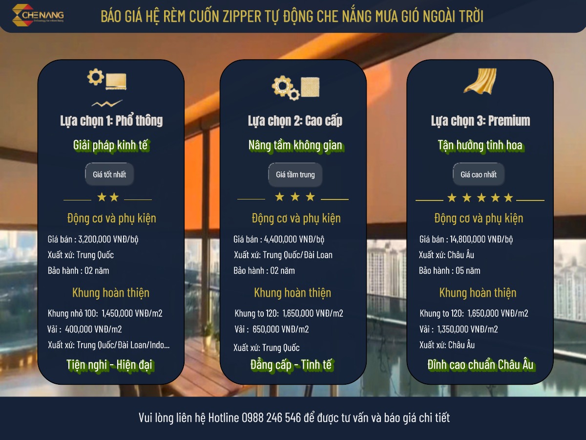 Hệ rèm Zipper tự động có các mức giá khác nhau, tương ứng với chất lượng vật liệu, động cơ và ứng dụng: