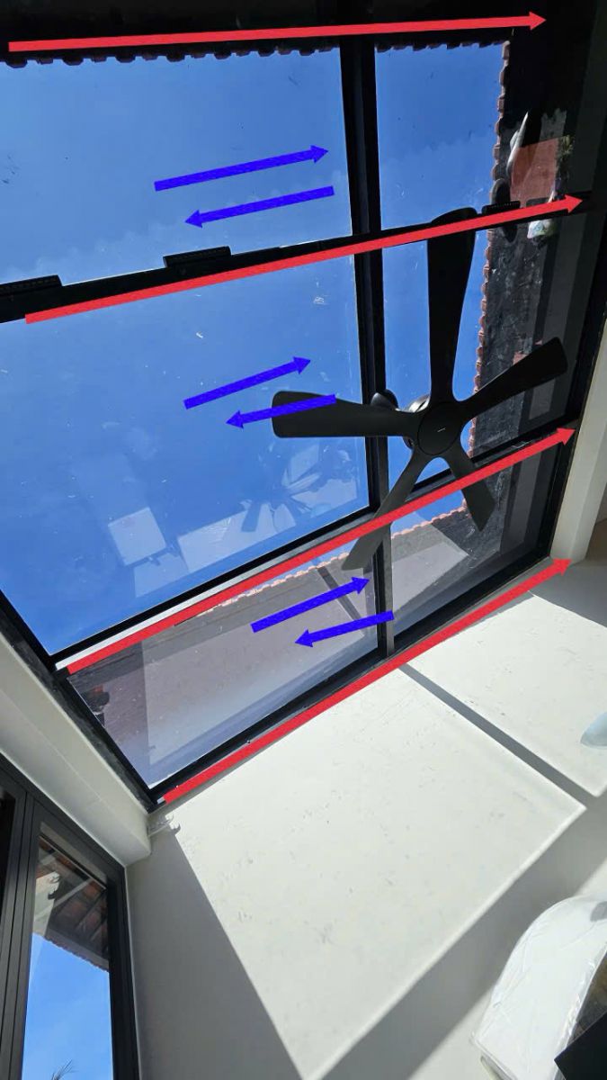 Vấn đề xảy ra rất điển hình của mái kính rộng: ánh sáng đẹp, rực rõ nhưng nhiệt lượng tích tụ lâu không thoát ra được không gian dưới mái kính trở nên nóng bức, ngột ngạt đến khó thở.