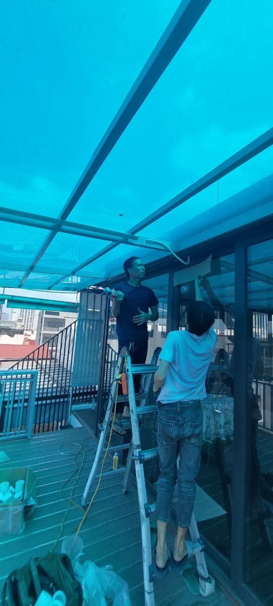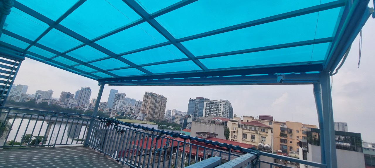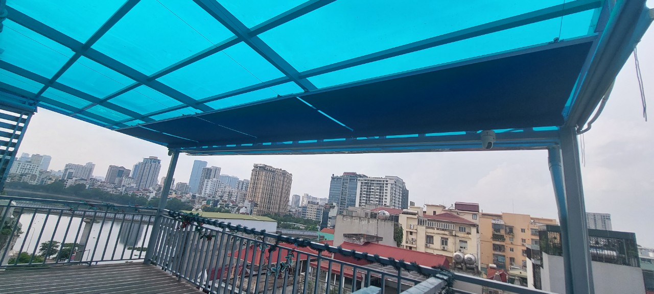 “Chị gửi giúp em ảnh khu vực cần làm nhé, để em xem kết cấu rồi đưa giải pháp phù hợp nhất.” Vài phút sau, ảnh gửi đến — một không gian tuyệt đẹp! - Đó là khu nửa trong nhà, nửa ngoài trời trên tầng cao, xung quanh là vách kính, phía trước có mái hiên kính đua ra nhìn thẳng ra Hồ Hoàn Cầu. Vừa hiện đại, vừa có chút “nghệ”. - Nhưng đúng như chị nói: mái Polycarbonate này tuy sáng và đẹp, nhưng lại khiến không gian phía dưới bị nóng và chói. Thêm nữa, phần khe hở còn làm nước mưa nhỏ xuống. Vậy là bài toán đặt ra: phải che nắng – chống mưa – vẫn đẹp và bền. Mình nghĩ đến hai phương án:
