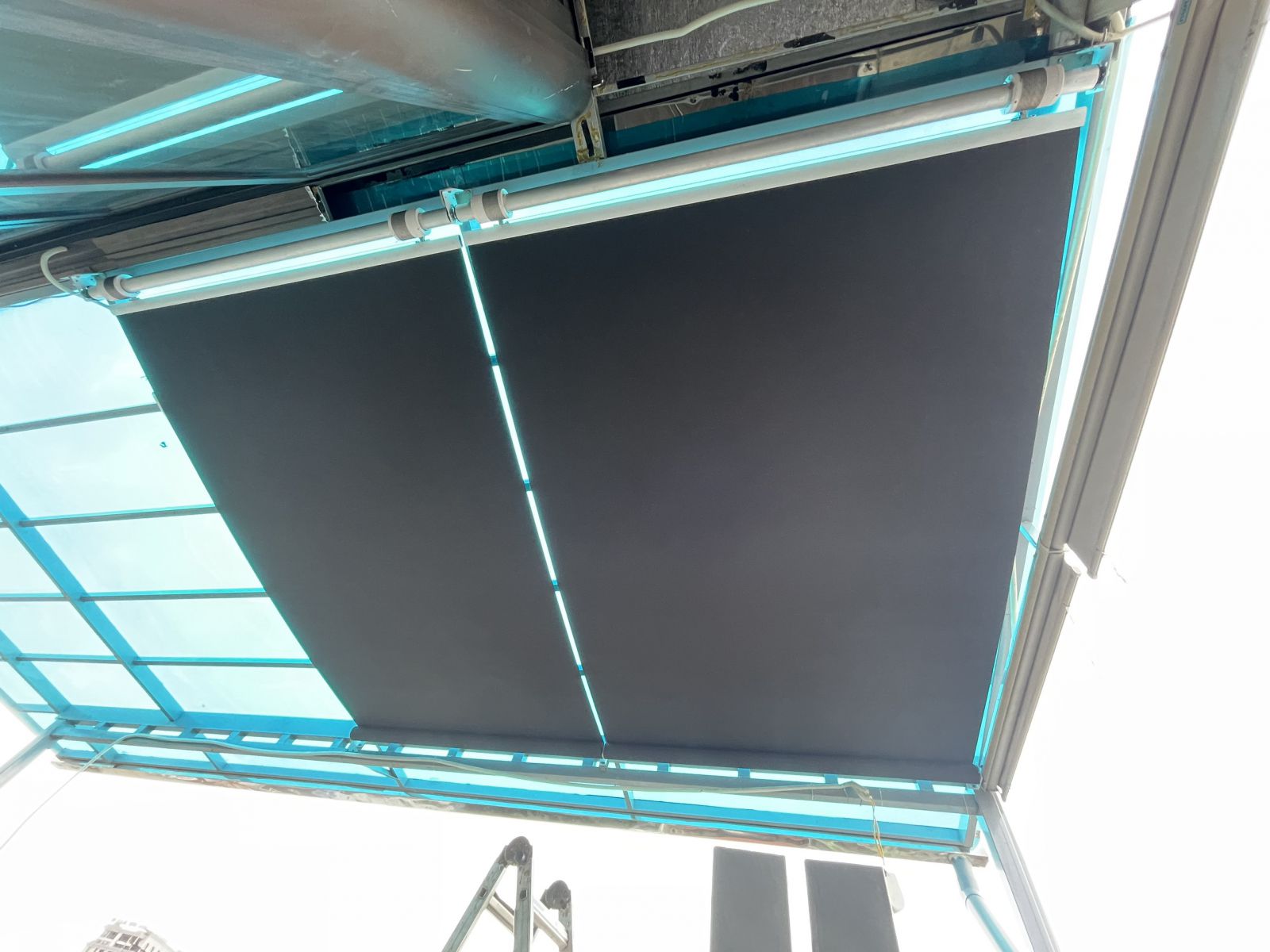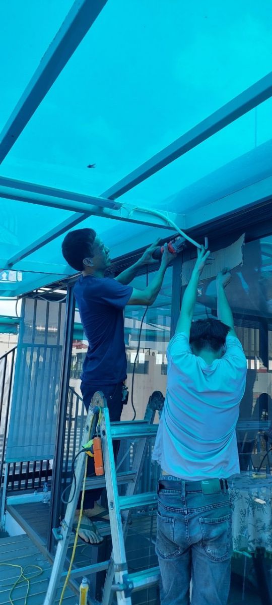 Khi đến nơi, chị đã tìm hiểu kỹ về sản phẩm rồi, nên cuộc gặp tập trung hẳn vào phần kỹ thuật: chia bộ, bố trí ray, và gia cố sao cho vừa gọn gàng – vừa chắc chắn – vừa đẹp mắt. Ban đầu, mình tính chia làm 2 bộ chạy ngang, nhưng vì chiều dài mái kính tới gần 6m, nên có thể vải sẽ hơi võng nhẹ, khả năng sẽ ít bền hơn. Mình chia sẻ thẳng thắn điều đó. Chị suy nghĩ một chút rồi nói: “Thế thì chia làm 4 bộ chạy dọc đi em, cho chắc chắn và bền lâu.” Vậy là xong – chốt gọn nhẹ như một cái gật đầu. Công trình được triển khai nhanh chóng và hoàn thiện chỉ sau 02 ngày: