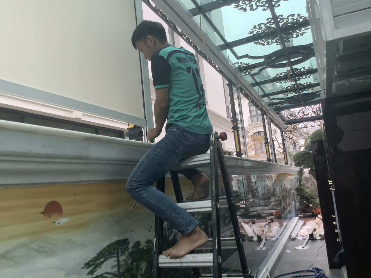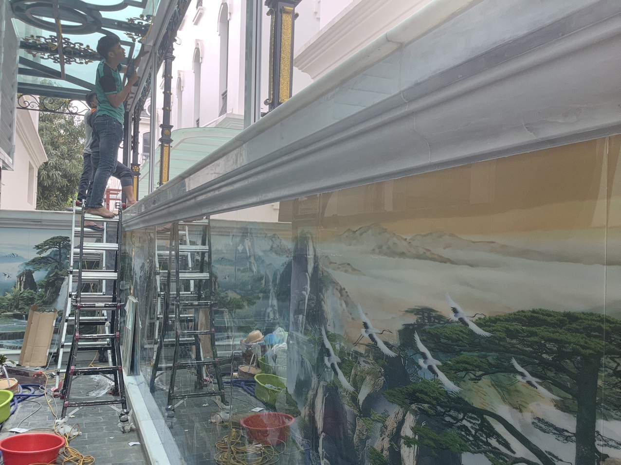 Ngon rồi thì lắp vải vào thôi, cẩn thận mấy cái tranh ở tường nhé ^o^