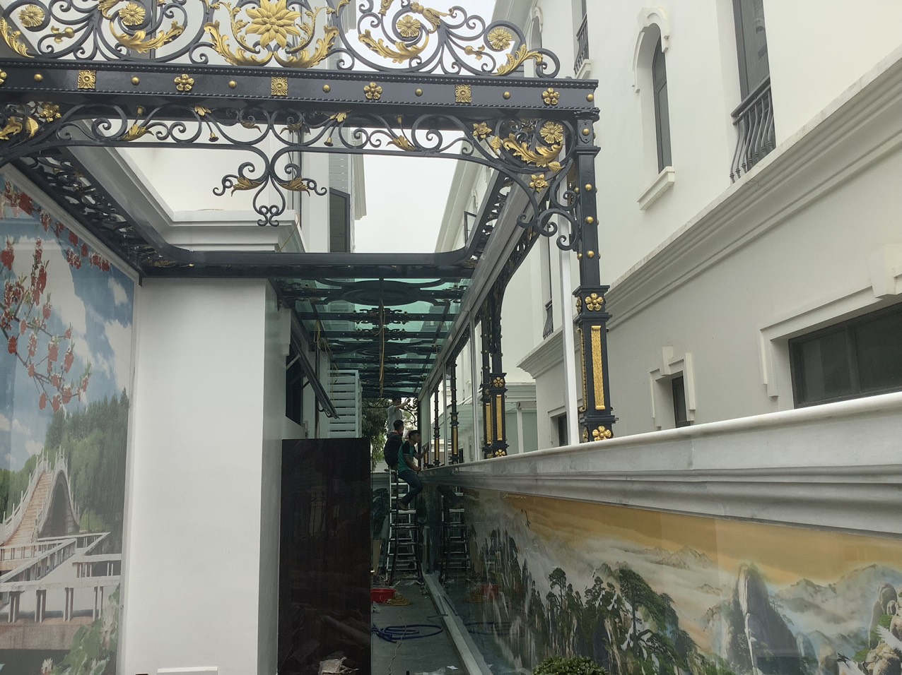 - Khảo sát thực tế không lệch nhiều so với bản thiết kế ban đầu. Hai bên chỉ bàn thêm về màu sắc, chất liệu vải bạt, cách bố trí ke và phương án lắp đặt sao cho tổng thể kiến trúc hài hòa nhất.