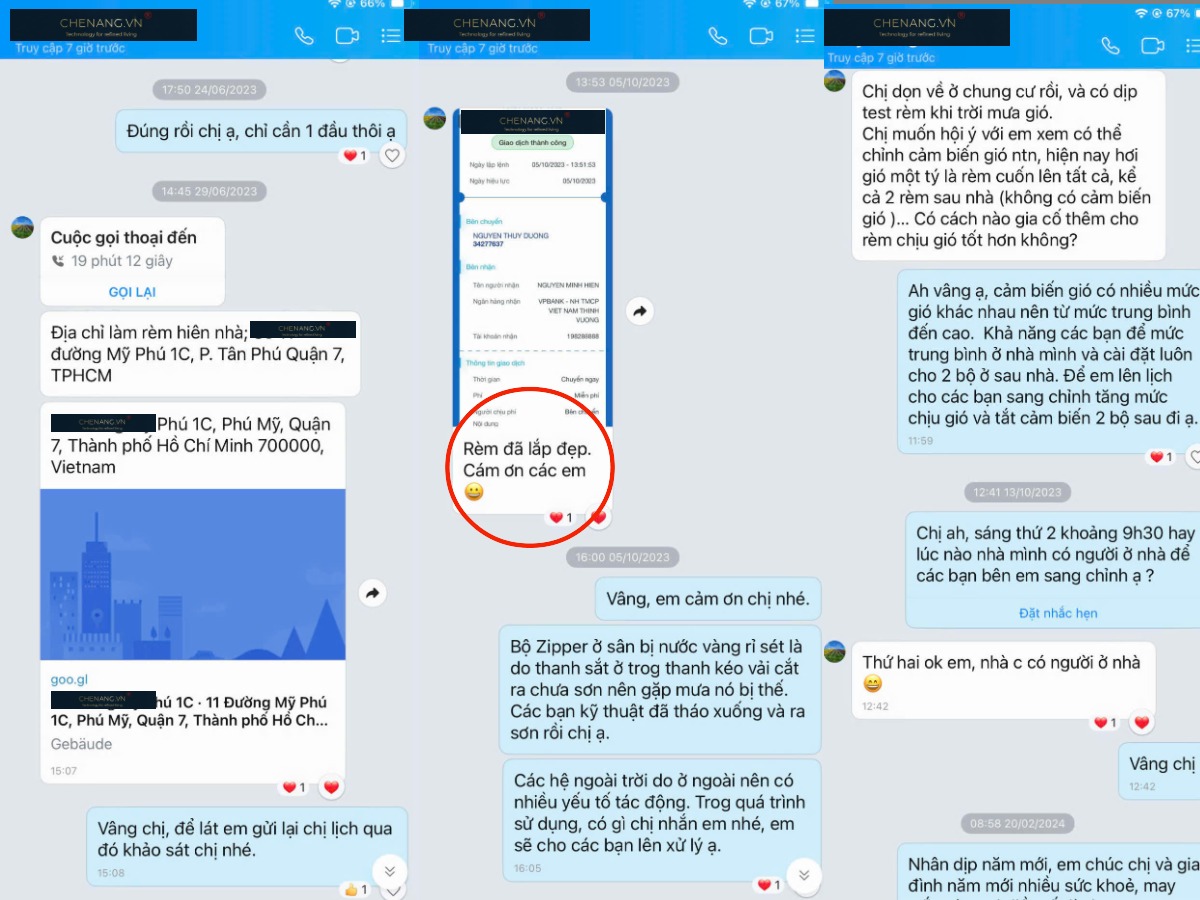 - Từ hôm đó, ngày nào cũng có một “chuyên mục dành riêng cho khách hàng đặc biệt”: chị hỏi, mình trả lời. Nói về chất liệu, công năng, độ bền, màu sắc, khả năng che sáng… Có hôm đang ăn cơm, điện thoại “ting ting”: “Em ơi, rèm chống nắng vải dày thì motor chịu được không?”