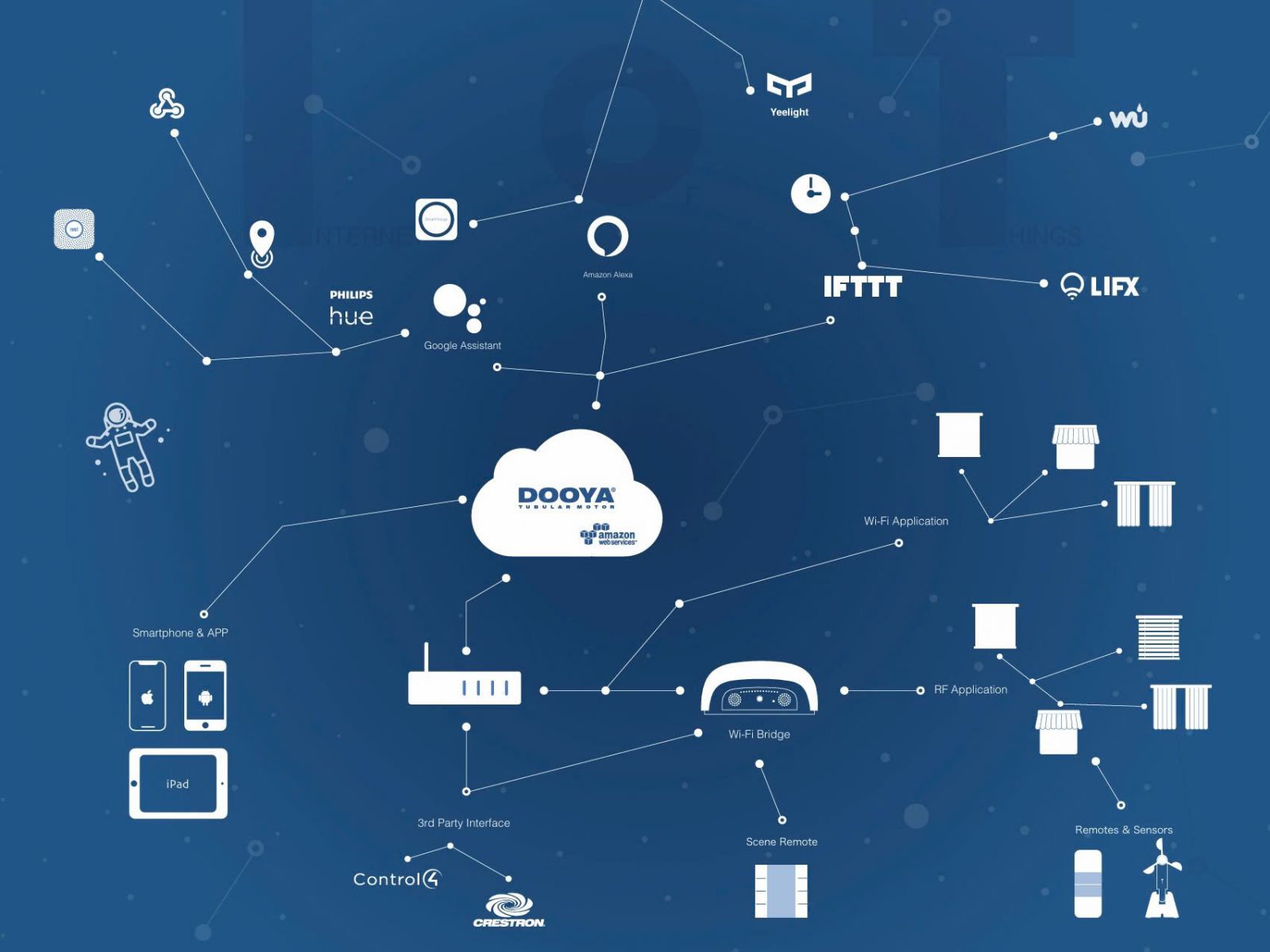 Dooya phát triển hệ sinh thái "Connector" bao gồm ứng dụng di động, Bridge (DD7002B) và các module kết nối. Đối với các đơn vị tích hợp hệ thống chuyên nghiệp, Dooya cung cấp Cloud API và Local IP-based API, cho phép các bộ điều khiển trung tâm (như Control4, Crestron hay Home Assistant) giao tiếp trực tiếp với động cơ rèm một cách ổn định.