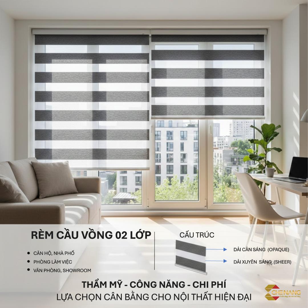 Rèm cầu vồng 2 lớp là lựa chọn cân bằng giữa thẩm mỹ – công năng – chi phí, phù hợp nhu cầu che nắng linh hoạt trong không gian nội thất hiện đại.